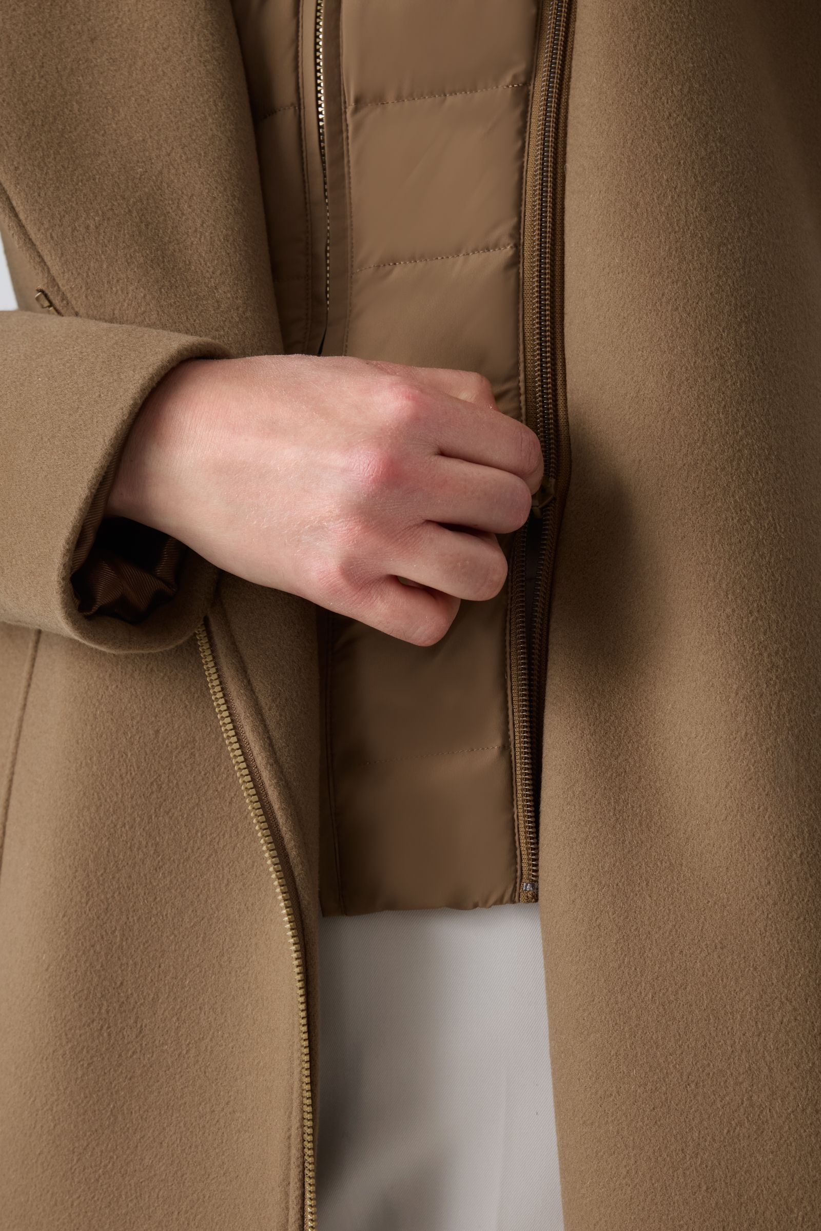 Der SHIA-SLB ist ein 2-in-1-Mantel mit der charakteristischen Mackage-Kapuze und einem abnehmbaren, leichten Latz aus recycelten Daunen mit Stehkragen. Er ist aus doppelseitiger Wolle gefertigt, wobei ein Obermaterial und ein Ledergürtel die asymmetrische, taillierte Reissverschlussfront betonen. Details aus verschiedenen Materialien und Lederpaspeln verleihen ihm eine elegante Note.