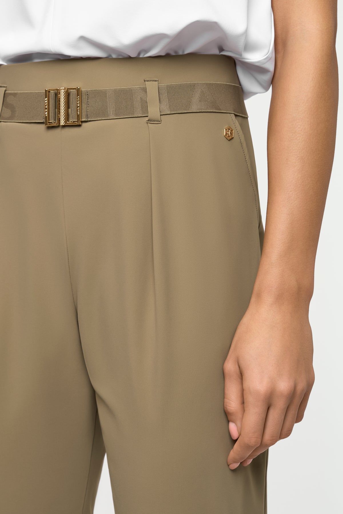 Die SIMETA Hose vereint Eleganz und Bewegungsfreiheit. Frontfalten, ein weicher Bund mit versteckter Tasche und der tonale Elastikgürtel mit goldener Schnalle sorgen für Komfort, während Rückenpasse und elastische Beinabschlüsse eine sportlich-elegante Silhouette schaffen. Kombinieren Sie sie mit dem TROINA Blazer oliva für einen chicen Ton-in-Ton Look.