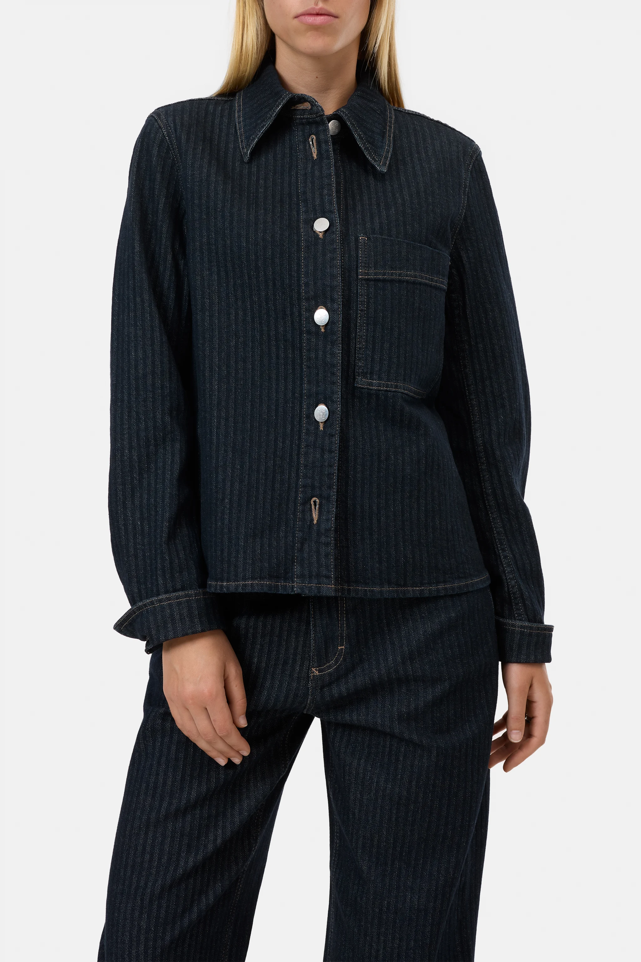 Unsere Denim Jacke hat eine moderne, gerade Silhouette und eine klassische Länge. Gefertigt aus hochwertigem Stretch-Denim. Schräge Nähte zieren die Brusttasche, ergänzt durch Metallknöpfe und Kontrastfäden. In Italien aus nachhaltiger Baumwolle gefertigt.