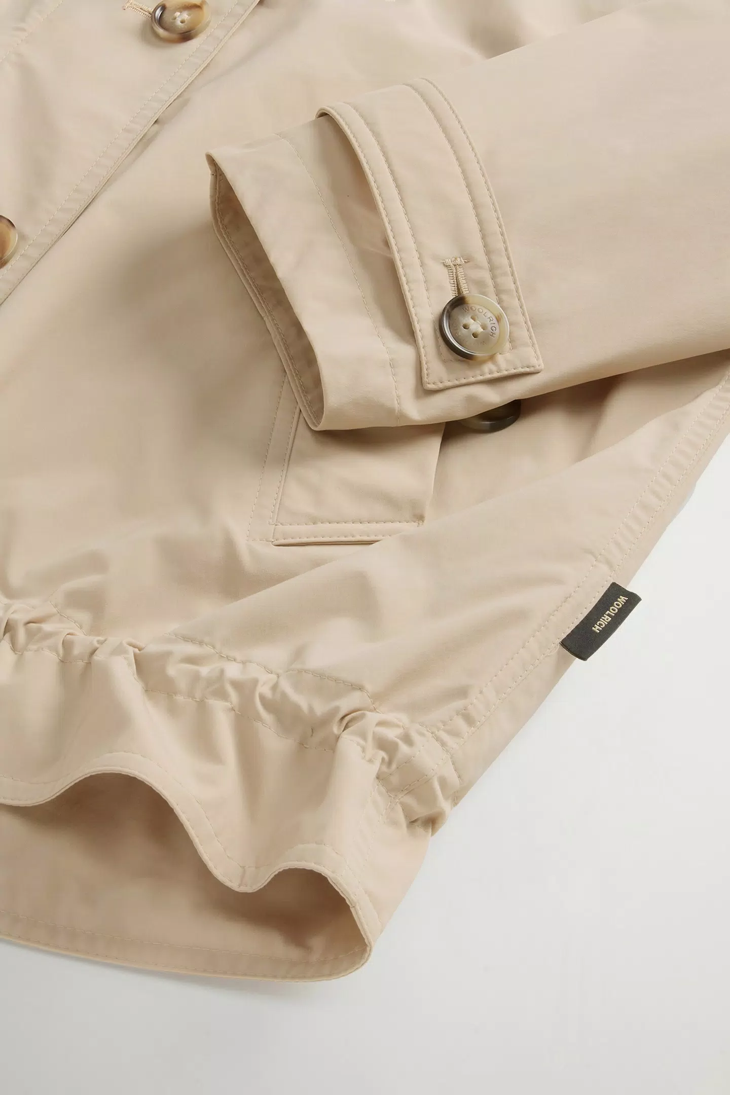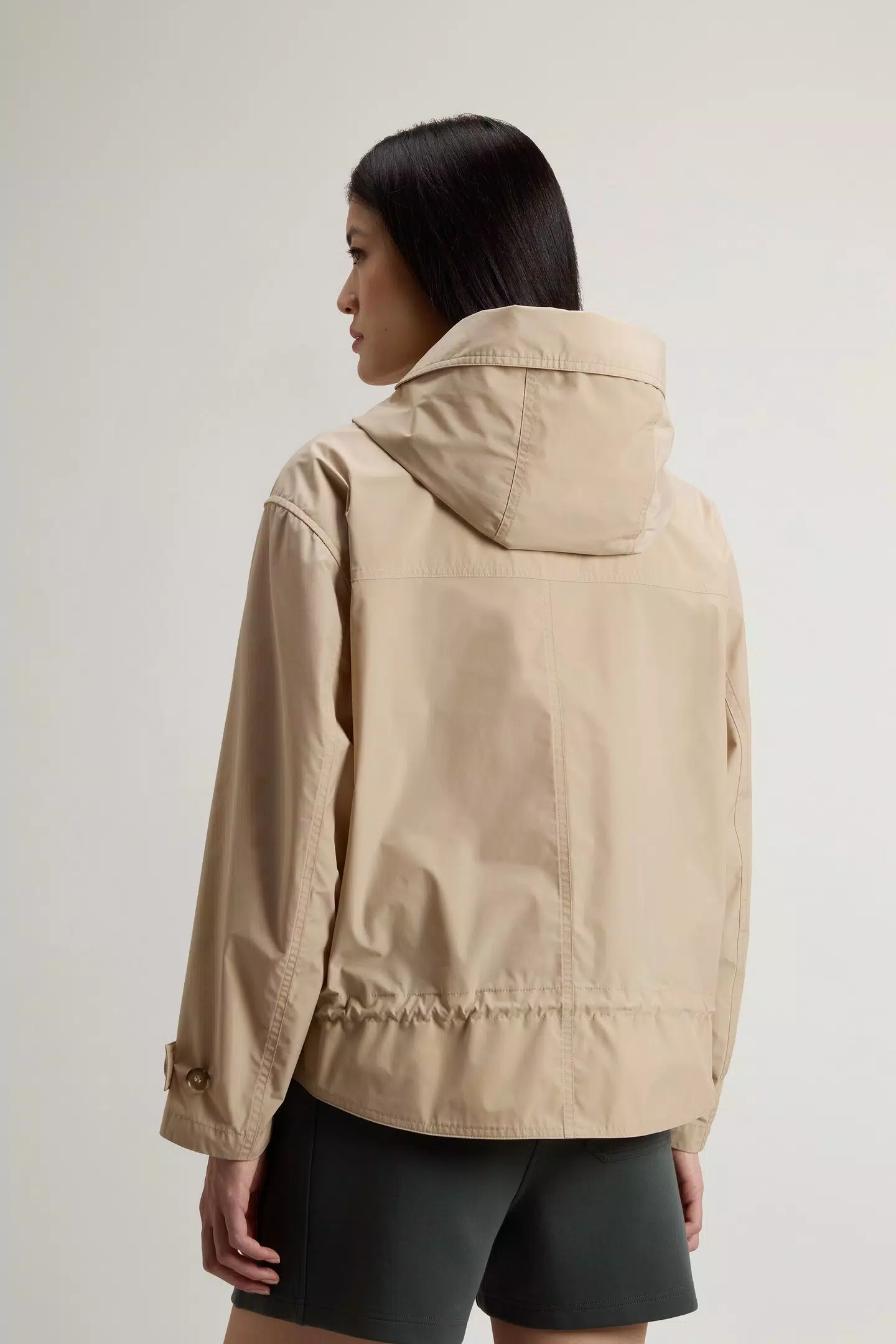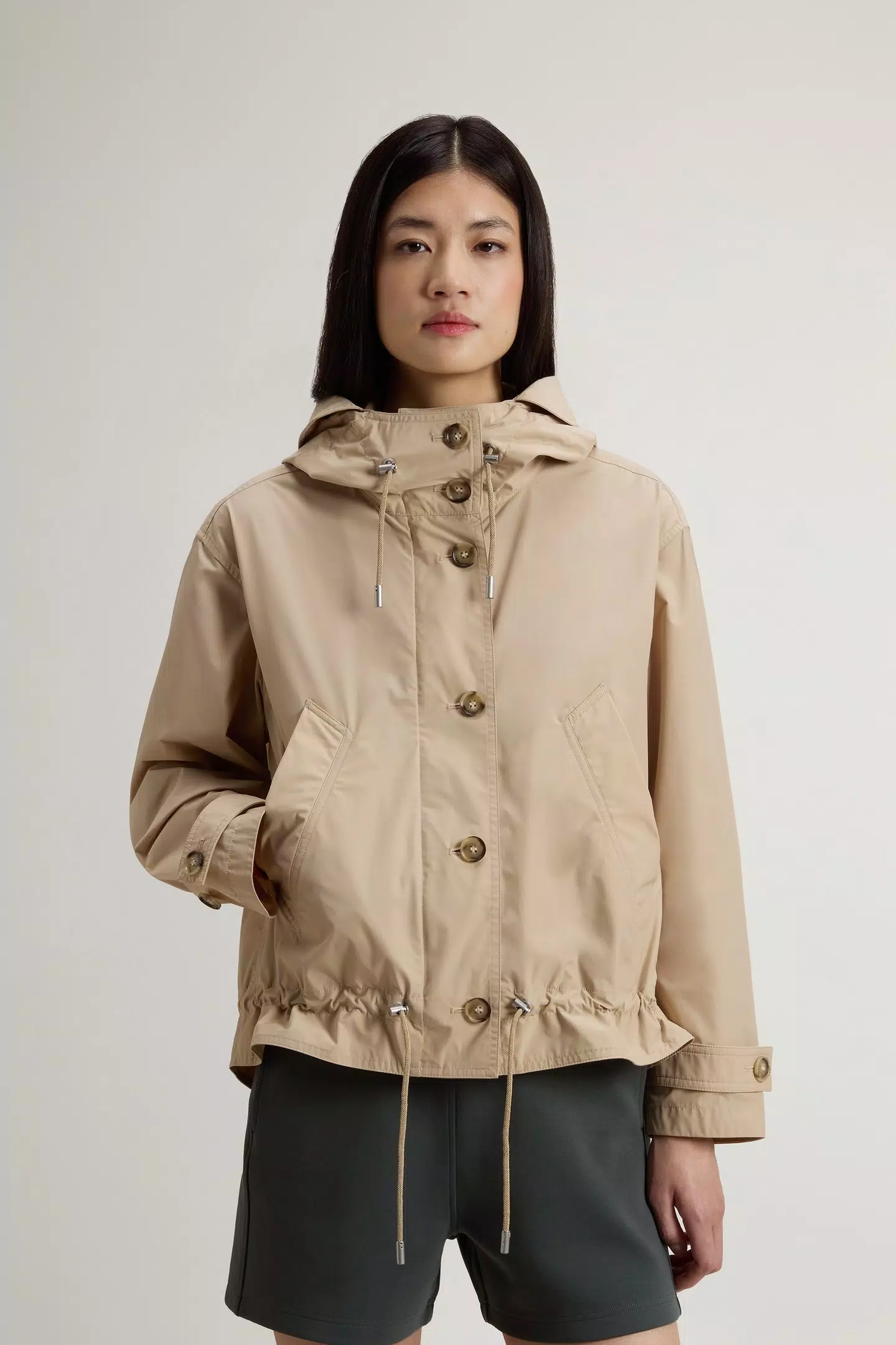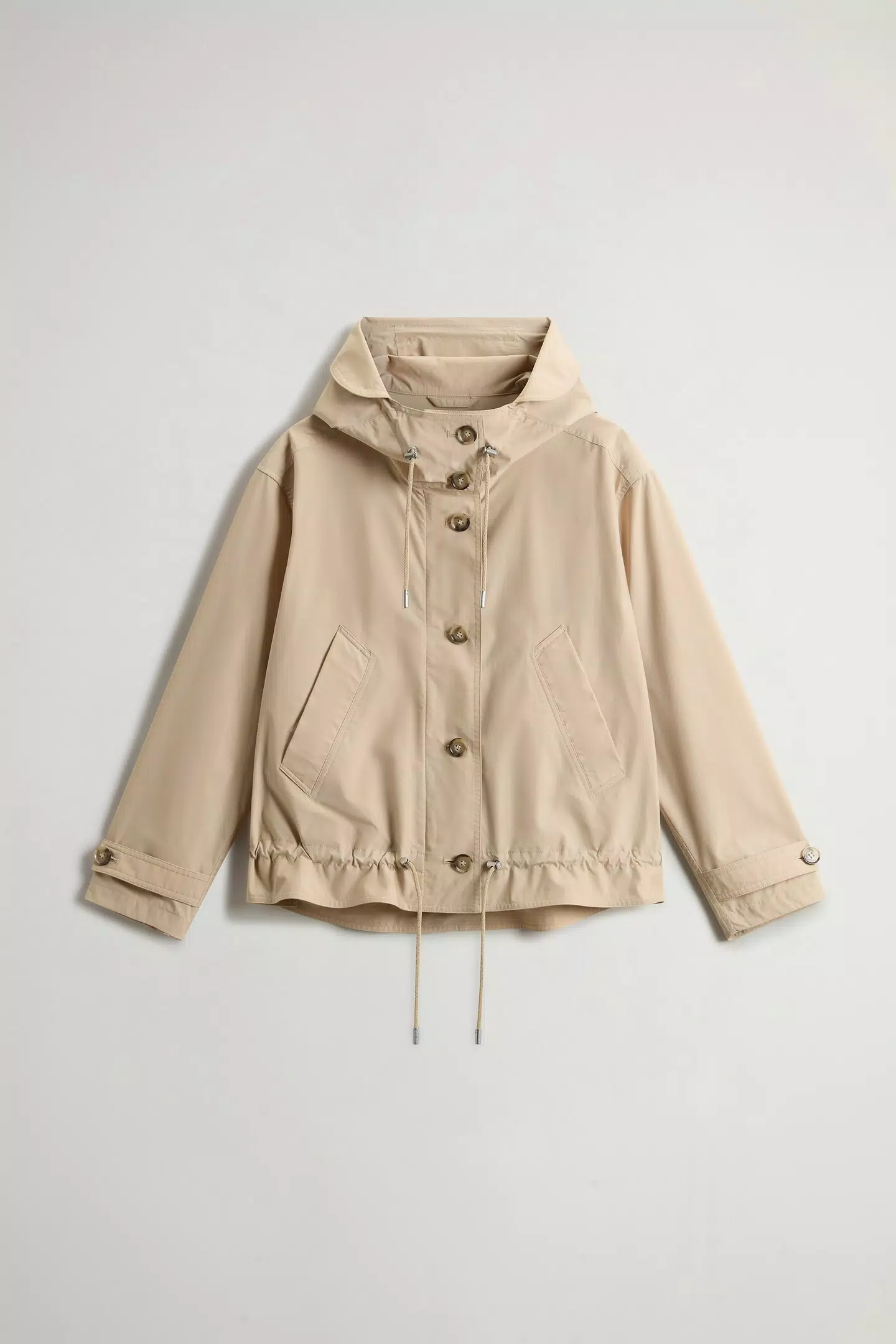 Dieser kurze Parka im urbanen Stil ist kompakt, funktionell und besteht aus einem wasserabweisenden und windbeständigen Urban-Touch-Gewebe. Der hohe Kragen mit verstellbarer Kapuze schützt, ohne die Silhouette zu beschweren, während die Seitentaschen, die verstellbaren Ärmelabschlüsse und der Kordelzug am Saum eine individuelle Anpassung der Passform ermöglichen. Das seitliche Logo-Label, ein dezentes und zugleich unverwechselbares Detail, rundet das Design ab.