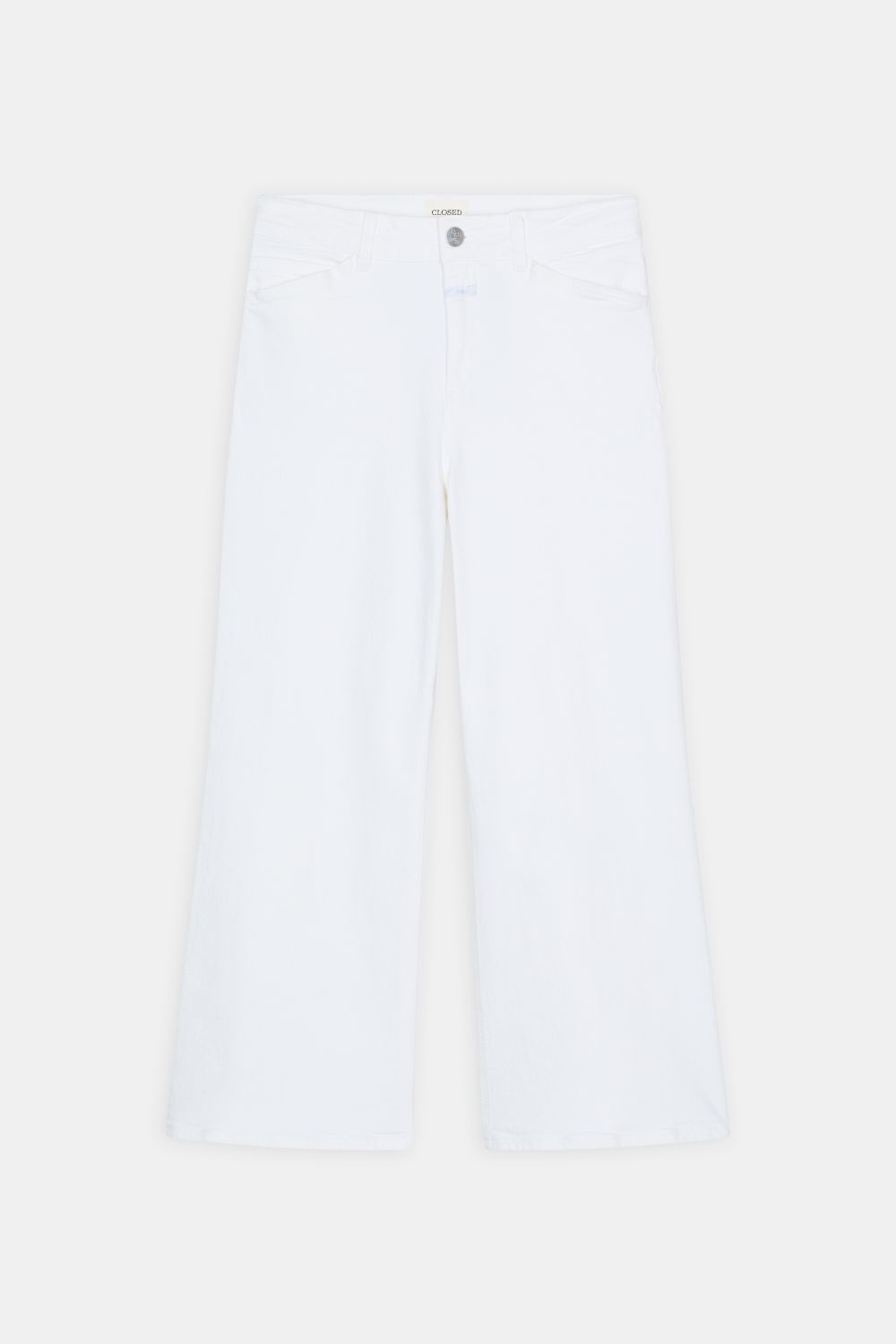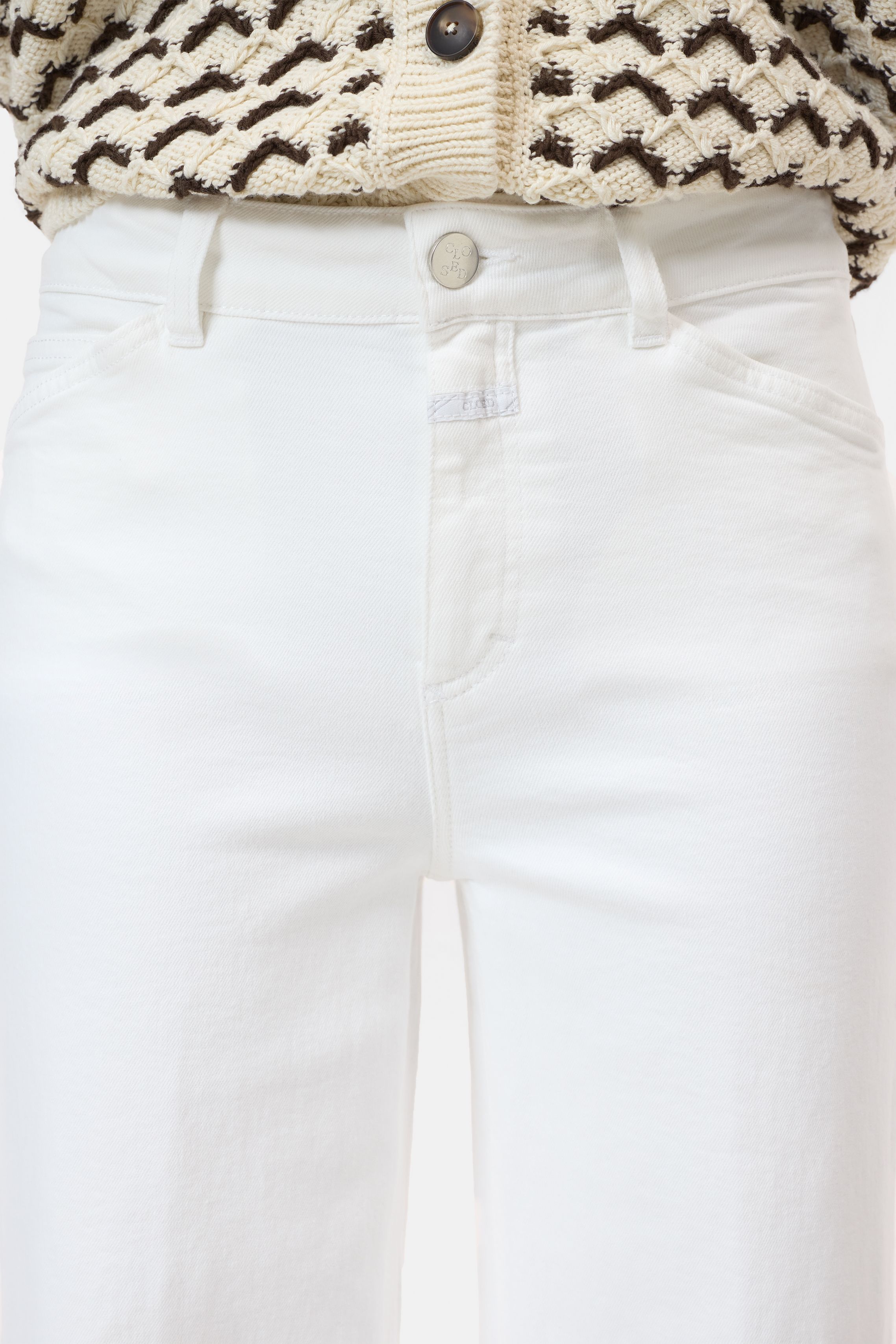 Ein authentischer weisser 3/1 Rechtsköper-Denim mit idealem Gewicht für maximalen Komfort, produziert mit BCI-Baumwolle für ökologische Nachhaltigkeit. Unsere Jeans Wera präsentiert sich mit weitem Schnitt, hoher Leibhöhe und verkürztem, leicht ausgestellten Bein in einer modernen Culotte-Silhouette. In Italien handgefertigt, besticht diese Premium-Jeans durch ihre innovative Vordertaschenform, die von unseren charakteristischen X-Pockets inspiriert wurde.