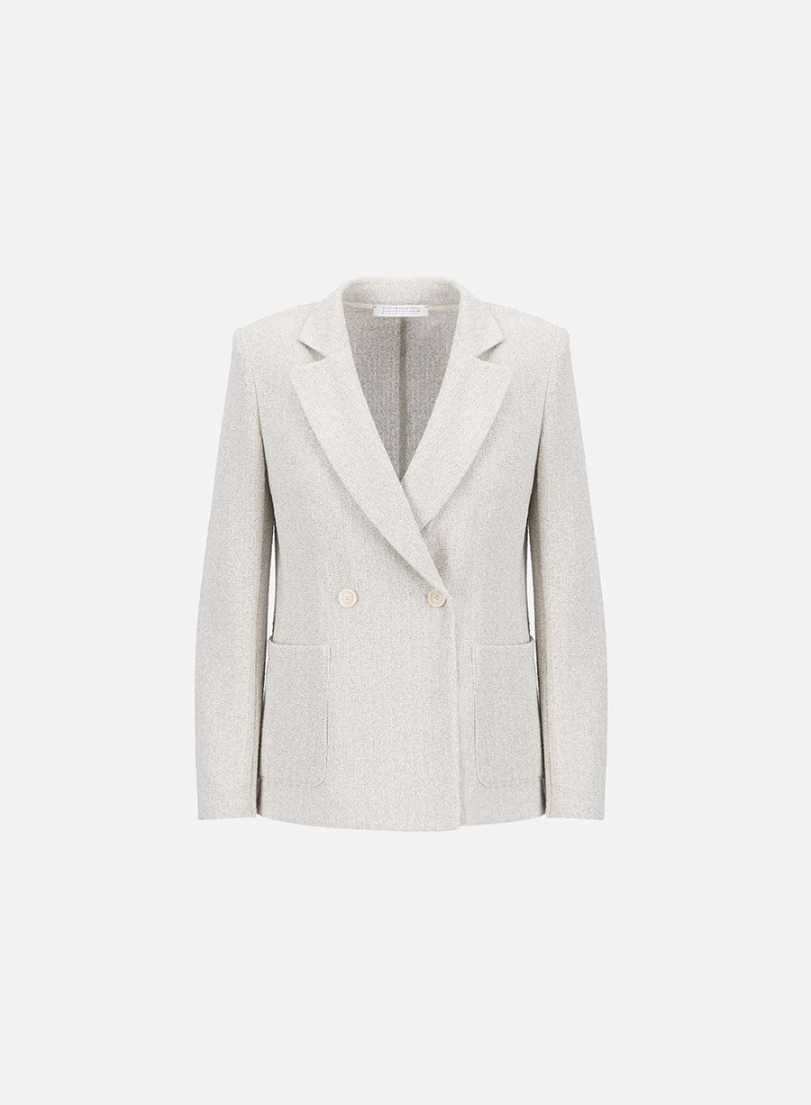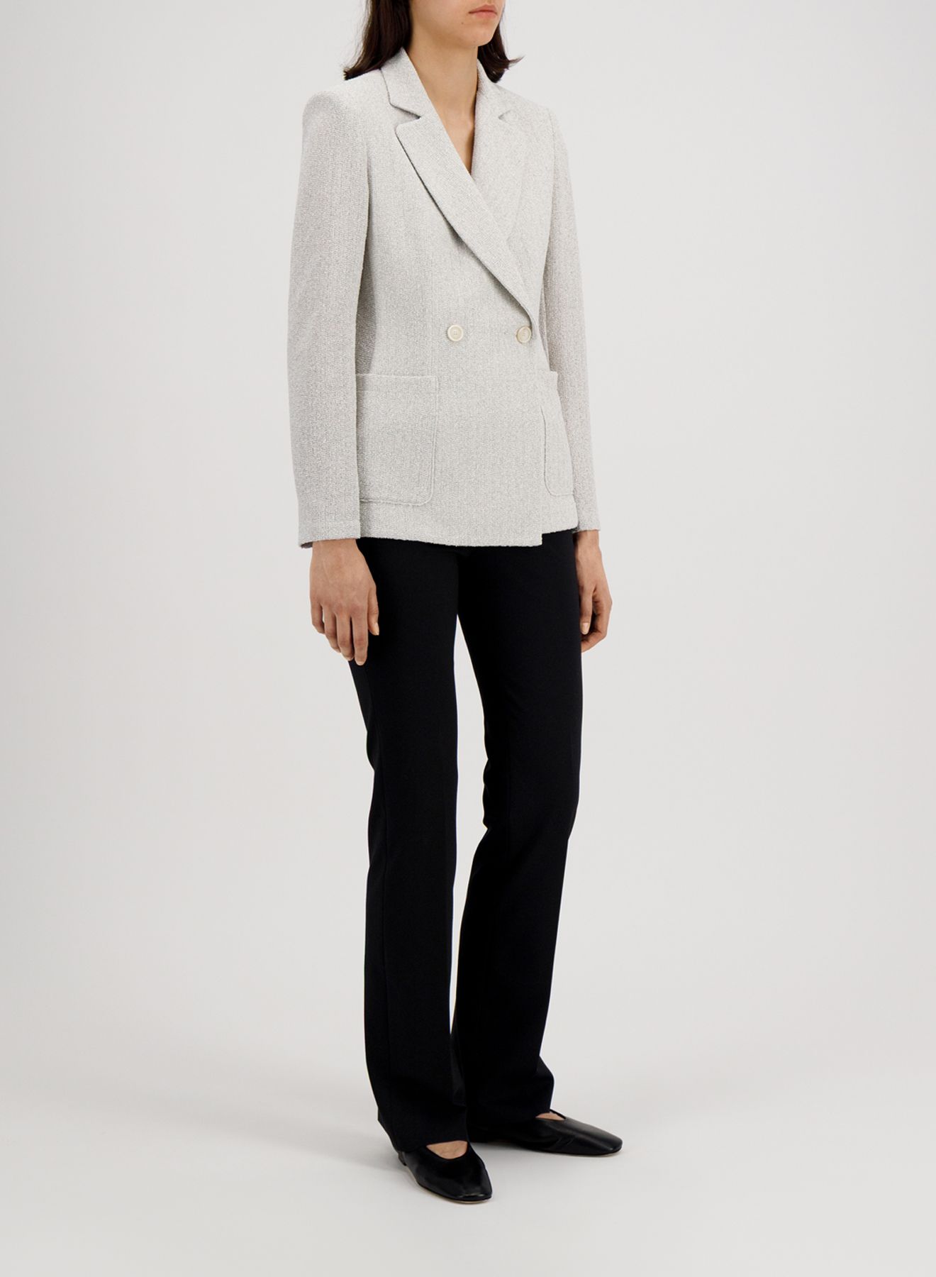 Doppelreihiger Blazer mit Schulterpolstern und langen Ärmeln, ausgestattet mit Zweiknopf-Verschluss, aufgesetzten Taschen und breitem Revers. Saubere Verarbeitung. Hergestellt in Italien aus italienischem Stoff.