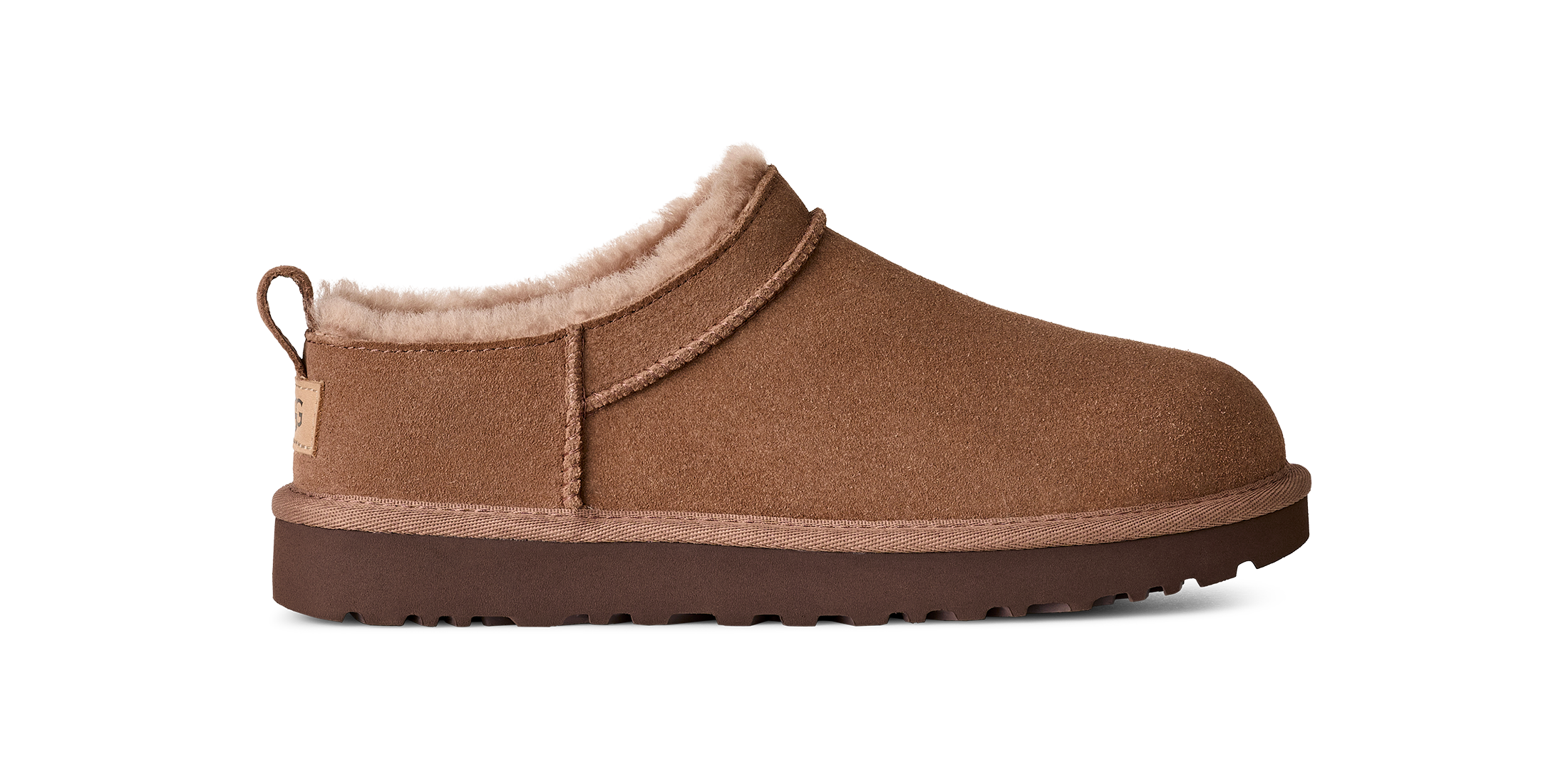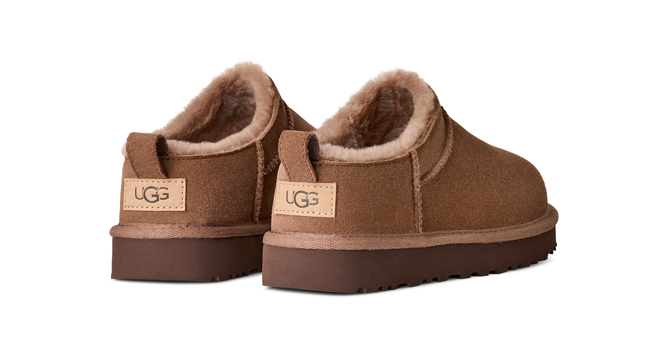Gewebtes Etikett mit UGG®-Logo auf der Innensohle, geprägtes Lederetikett mit UGG®-Logo an der Ferse
